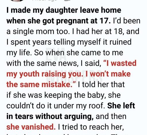 The memory of that doorway never loosened its grip on me. Even as the years passed and my hair turned gray, that threshold remained frozen in time, a place where love failed and pride took control. Sixteen years earlier, I stood there as a frightened, angry mother and did something unforgivable. My daughter was barely seventeen when she came to me, her hands shaking, her voice barely holding together as she said, “Mom, I’m pregnant.”