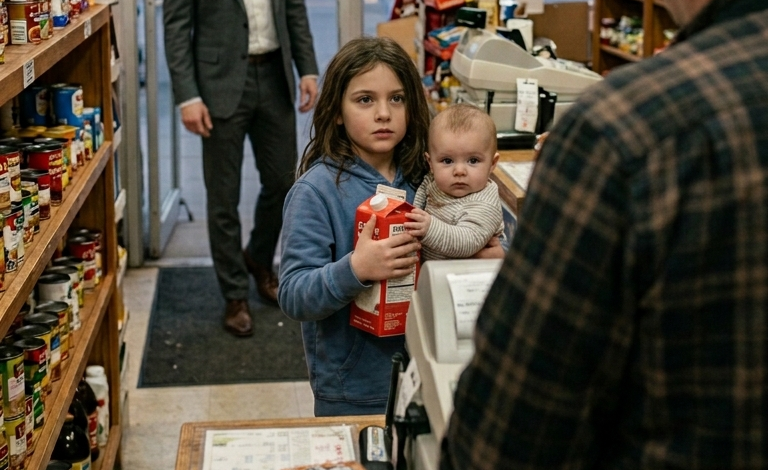 In one arm, she held her baby brother close against her chest, his tiny body wrapped in a thin blanket as he let out soft, restless cries. In her other hand, she gripped a carton of milk with surprising strength, as if it were the most valuable thing she had ever held.