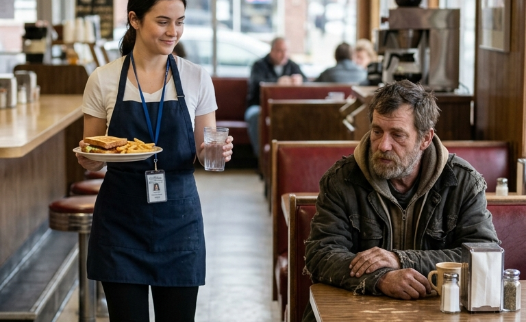 He sat in the corner booth by the window, shoulders slightly hunched as if trying to disappear. His coat was worn and faded, his hair unkempt, his beard touched with gray. His hands rested quietly on the table, rough and weathered, like they had carried weight most people would never understand.