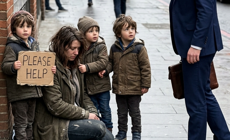 On the edge of the sidewalk sat a woman holding a small cardboard sign. Beside her stood three little boys, no older than four. They wore mismatched jackets, clearly donated, and their shoes were worn thin. Despite everything, they looked clean, cared for in whatever way she could manage.