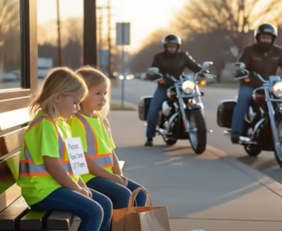 Two little girls sat side by side on a cold metal bench, dressed in bright yellow safety vests. They couldn’t have been more than six and eight. Between them was a paper bag, a folded note, and a single blue balloon tied to the bench—swaying gently in the wind like a silent cry for attention.
