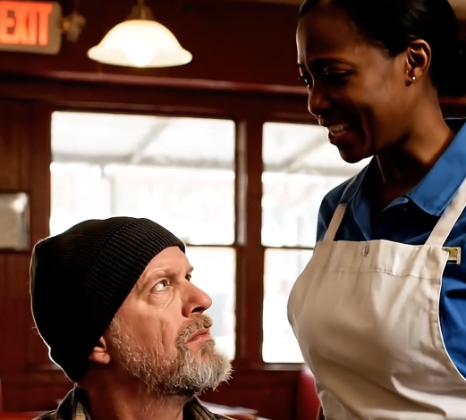 A young waitress standing nearby took a deep breath, then walked toward him with a calm, gentle expression. There was no hesitation in her steps, no judgment in her eyes.